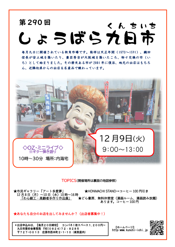 毎月九日に開催されている街角市場です。発祥は天正年間(1573~1591)、織田信長が安土城を築いたり、豊臣秀吉が大阪城を築いたころ、物々交換の市(いち)として始まりました。その歴史ある市が2001年に復活、地元の出店はもちろん、近隣他県からの出店&名産品で賑わっています。